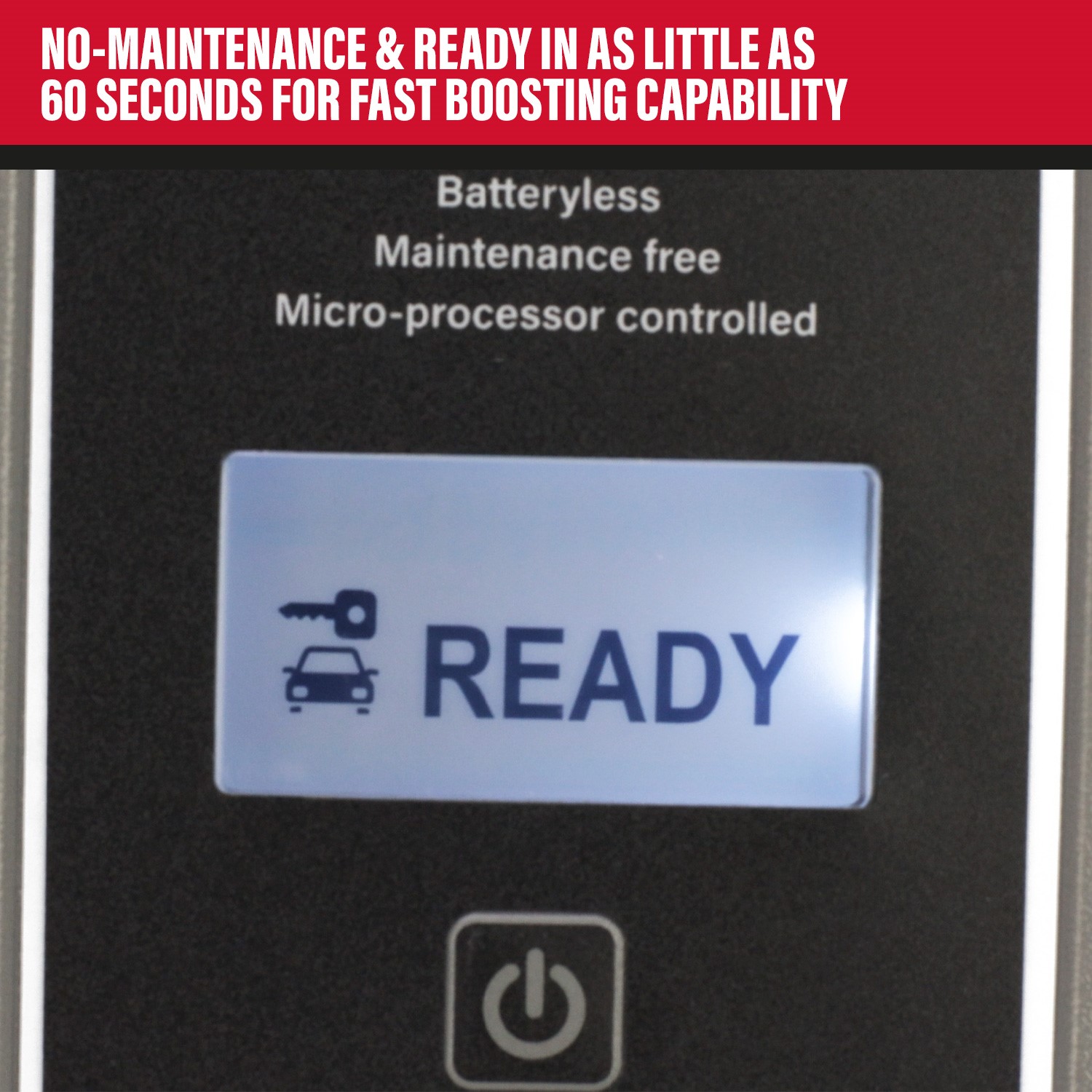 How does it work? By connecting the positive/negative clamps from the capacitor unit to the terminals of a flat battery, the capacitor cell absorbs remaining voltage in around 60 seconds. A single touch 'on' button initiates power transfer and a digital display indicates the unit is 'preparing' then 'ready' to deliver boosting current to the vehicle.
