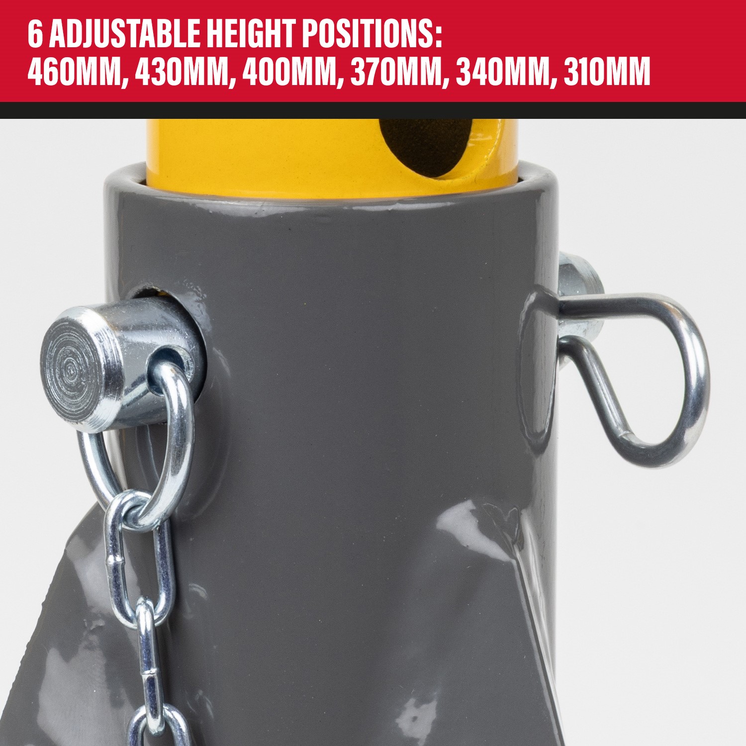 HEAVY-DUTY JACK STANDS FEATURING A SOLID BAR PIN DESIGN & 6 HEIGHT ADJUSTABLE POSITIONS TO ENSURE SAFETY & STABILITY UNDER LOAD