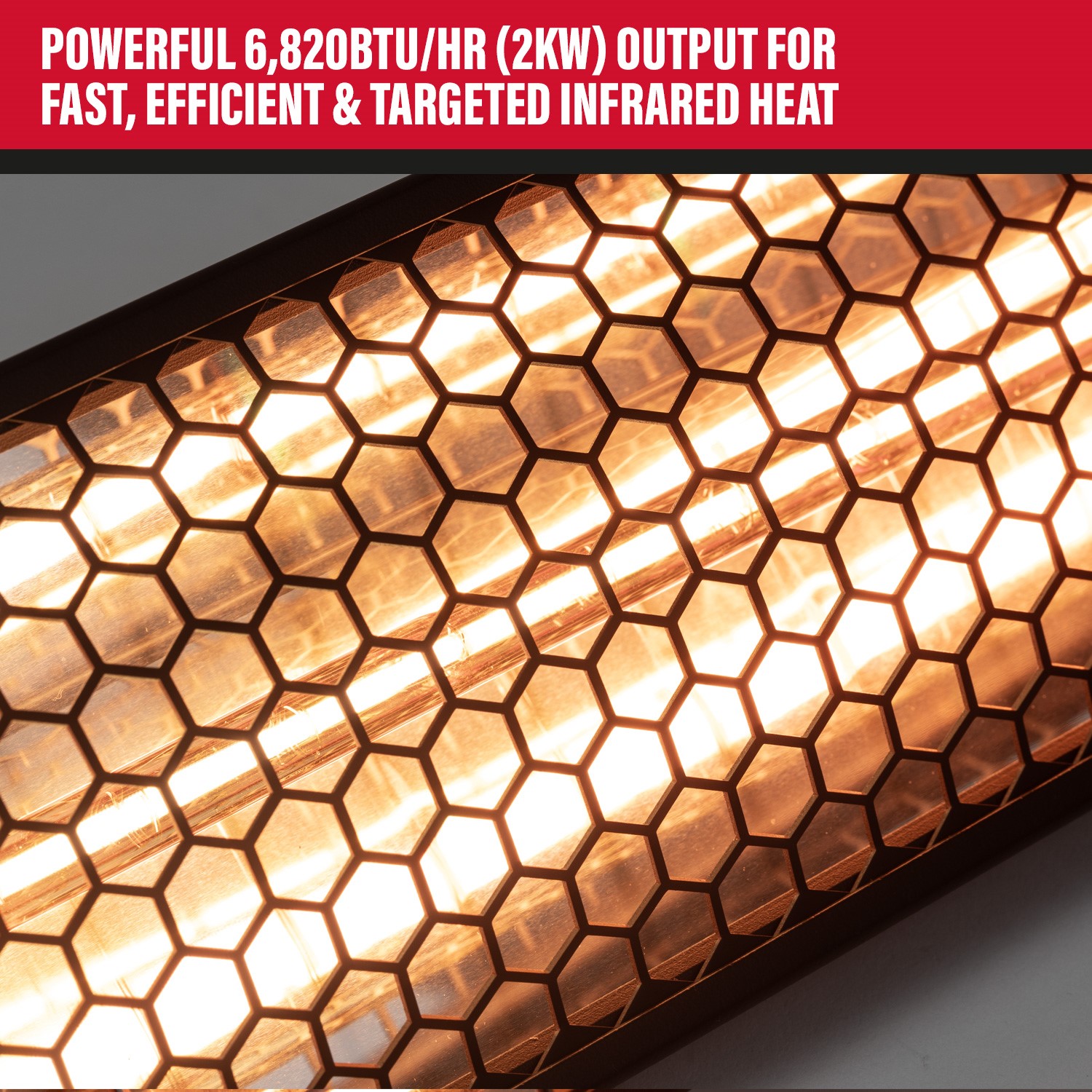 With a gold HeLeN-coated halogen lamp, this heater provides targeted radiant heating of objects and surfaces rather than simply warming the air, up to 6,820BTU/hr. This provides more efficient heating and a potential reduced energy consumption of up to 40% compared to conventional heaters.