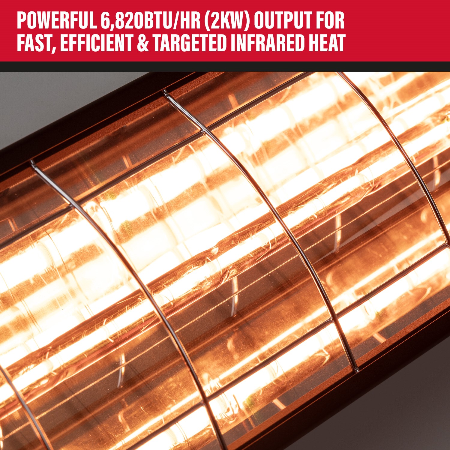 With a gold HeLeN-coated halogen lamp, this heater provides targeted radiant heating of objects and surfaces rather than simply warming the air, up to 6,820BTU/hr. This provides more efficient heating and a potential reduced energy consumption of up to 40% compared to conventional heaters.