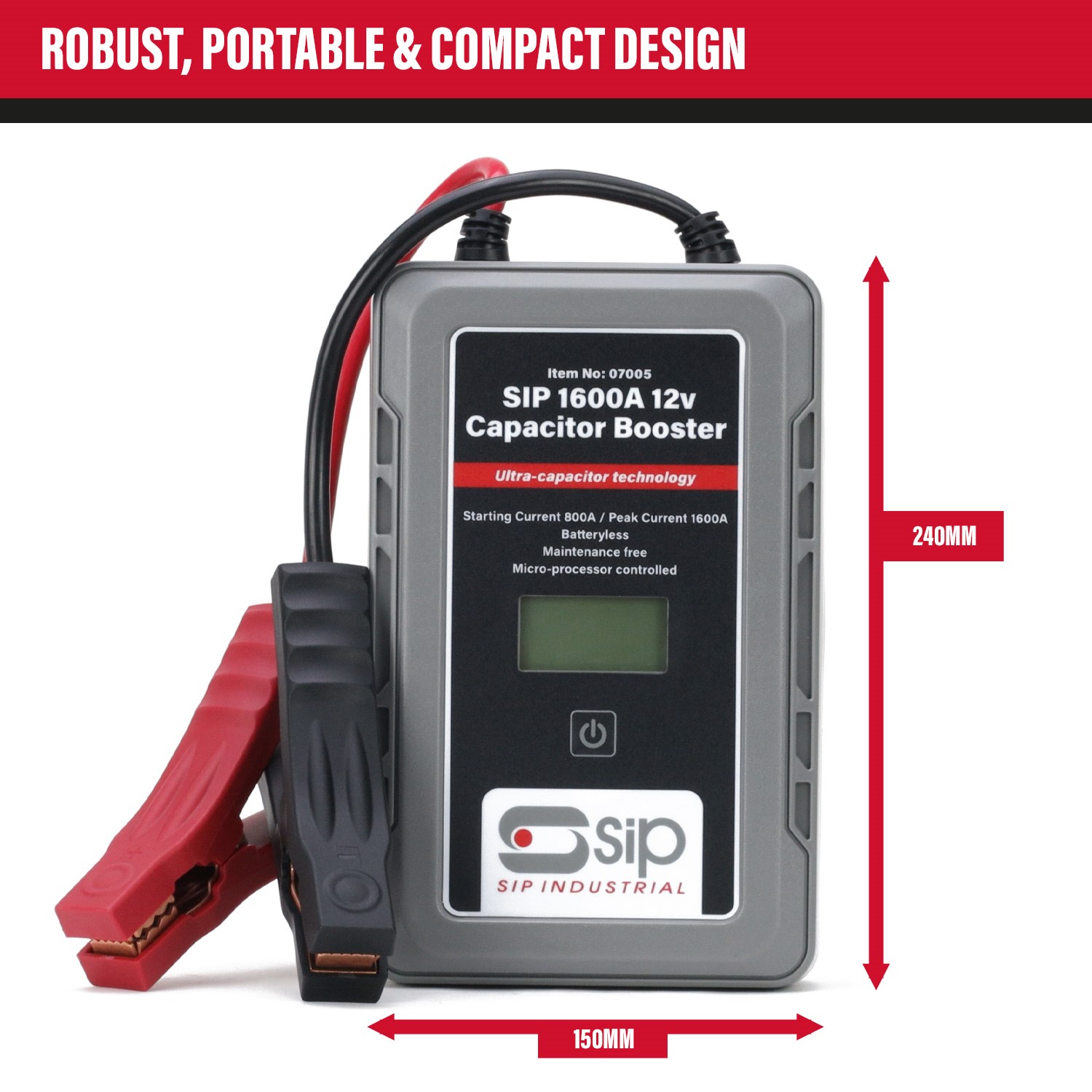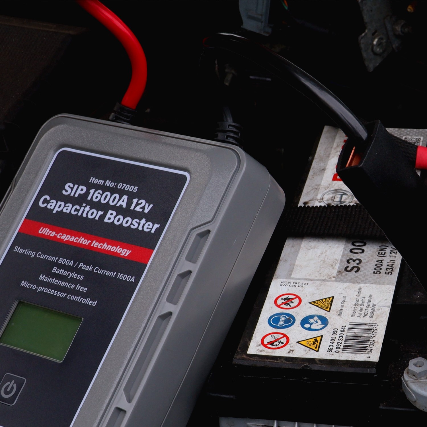 The SIP 1600A 12v Capacitor Booster is an innovative handheld portable device designed to discharge a high current boost needed to start a large car or large plus agricultural or construction equipment.