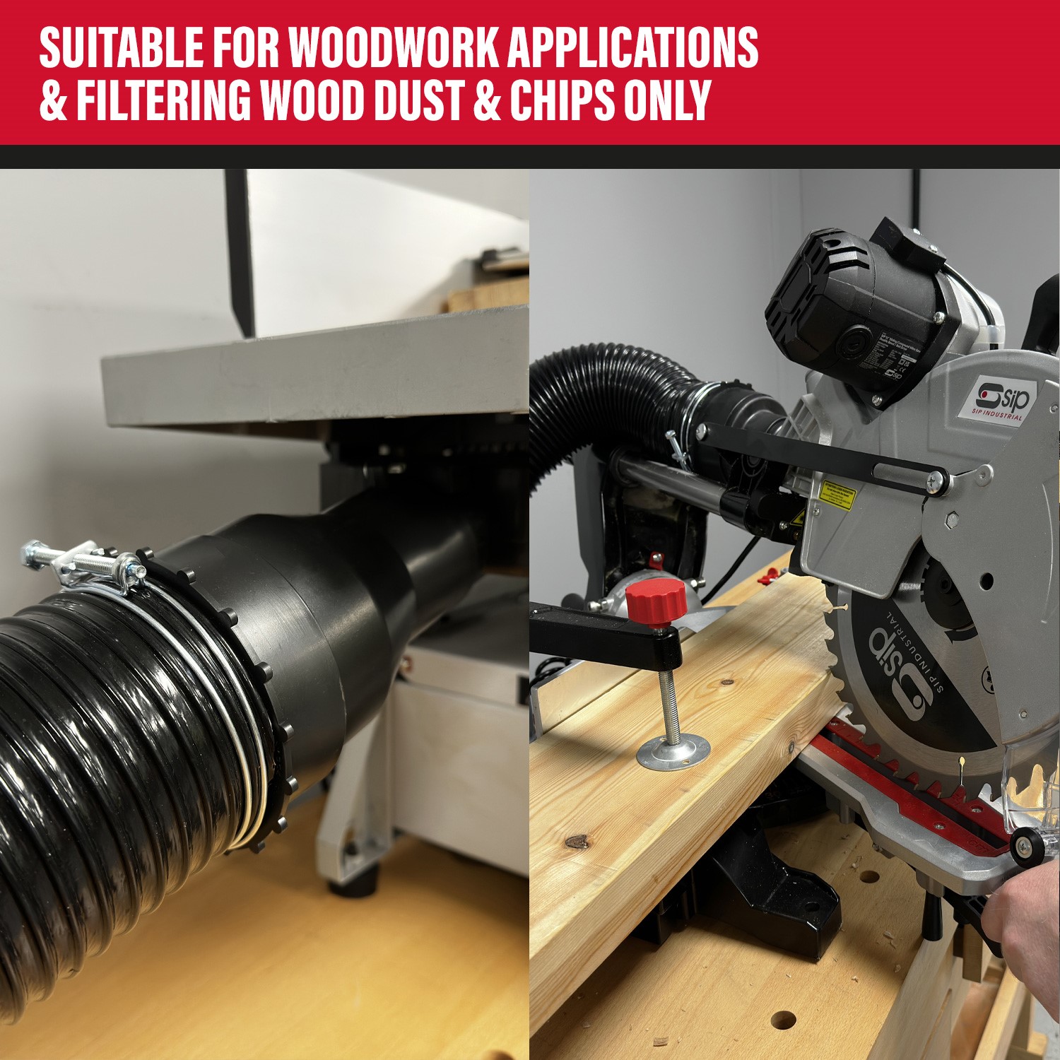 What's in the box?: SIP 50L 1100W Dust & Chip Extractor, cartridge filter, filter bag, 2m hose, 2x pipe clips and 5pc adaptor set (100mm to 105mm, 70mm, 45mm 40mm, 35mm).