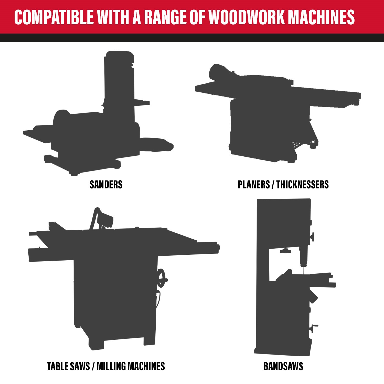 With 183m³/hr average airflow and a powerful 1.1kW motor, this unit provides robust collection performance that aids in providing a better workpiece surface finish as well as increased operator safety by reducing respiratory risks as a result of wood dust and chips.
