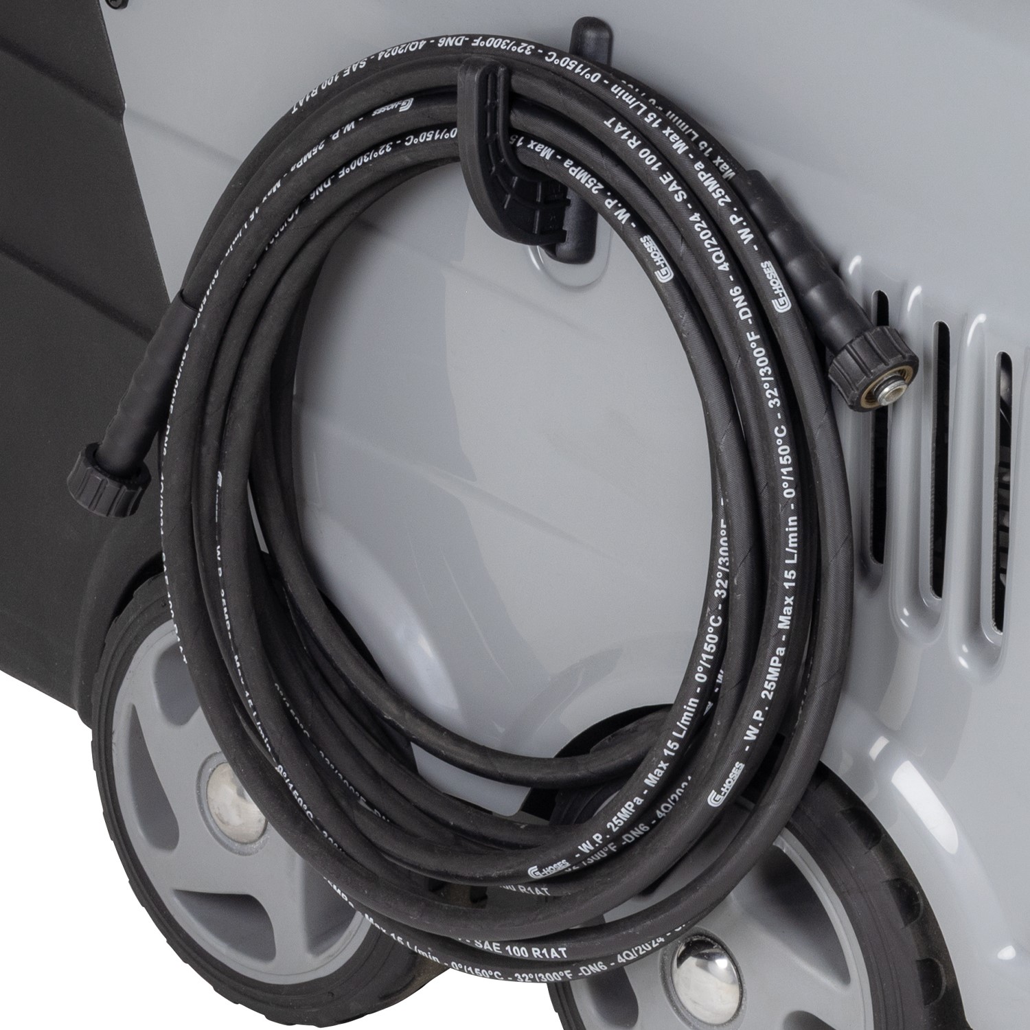For increased mobility over uneven surfaces and bumps, the PH720/150 is mounted on 4 wheels and fitted with a large handle for easy steering. To prevent tangling or trip hazards, it is designed with storage solutions for the lance, power cable and the 4 interchangeable nozzles included.