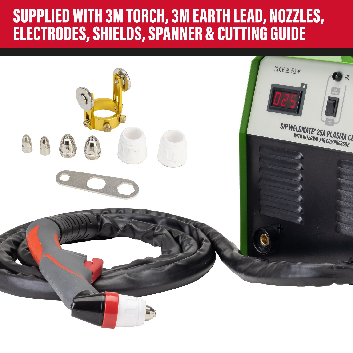 What's in the box?: 1x SIP WELDMATE® 25A Inverter Plasma Cutter (230v/13A), 1x integrated 3mtr plasma torch (supplied with additional electrodes, nozzles, ceramic shields and torch spanner), 1x plasma torch straight cutting guide, 1x 3mtr earth lead.